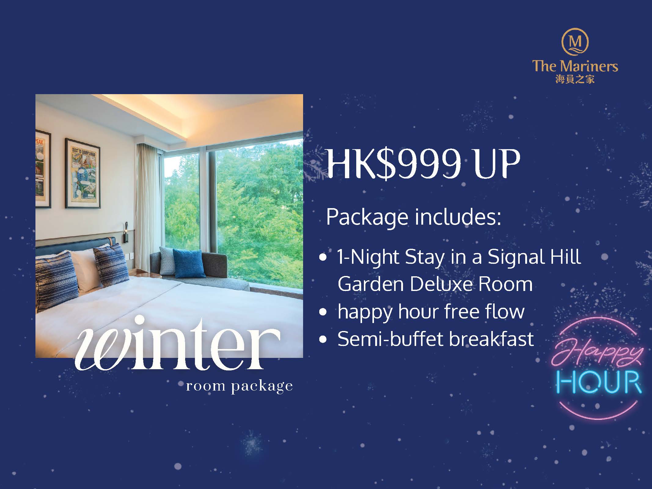 立即預訂即可享獨家冬日住宿優惠套餐!如有興趣成為會員或登記海員通行證使用我們的設施,請致電2163 2333與我們聯繫。入住日期:2025年9月15日至2026年1月31日房價由HK$999起套餐包括:– 一晚住宿– 歡樂時光雙人暢飲套餐(下午5至晚上7時)– 雙人半自助早餐以優惠價享用雙人4道菜套餐午餐或晚餐來提升您的住宿體驗:午膳套餐:淨價港幣299元晚膳套餐:淨價港幣689元我們亦提供其他套餐以供選擇,歡迎致電2163 2333或發送電郵至reservation@themariners.hk查詢。條款與細則:• 已包加一服務費。• 不適用於2025年12月24、25及31日。• 額外半自助早餐,小童(3-11歲)優惠價每位淨價港幣60元;小童將共享同房現有床鋪。• 額外晚膳套餐,小童(3-11歲)優惠價每位淨價港幣110元;小童將共享同房現有床鋪。• 以上優惠數量有限,先到先得。• 預訂確認將視乎房間供應情況而定。• 請提前以電郵方式至reservation@themariners.hk進行預訂。• 所有價格如有變動,恕不另行通知。• 如有任何爭議,海員之家保留最終決定權。保證金政策 : 預訂經確認後,全數房費將於提供之信用卡內扣除。取消政策:預訂經確認後,如有任何更改及取消或者未能辦理入住手續,全數房費將被收取並一概不獲退還。